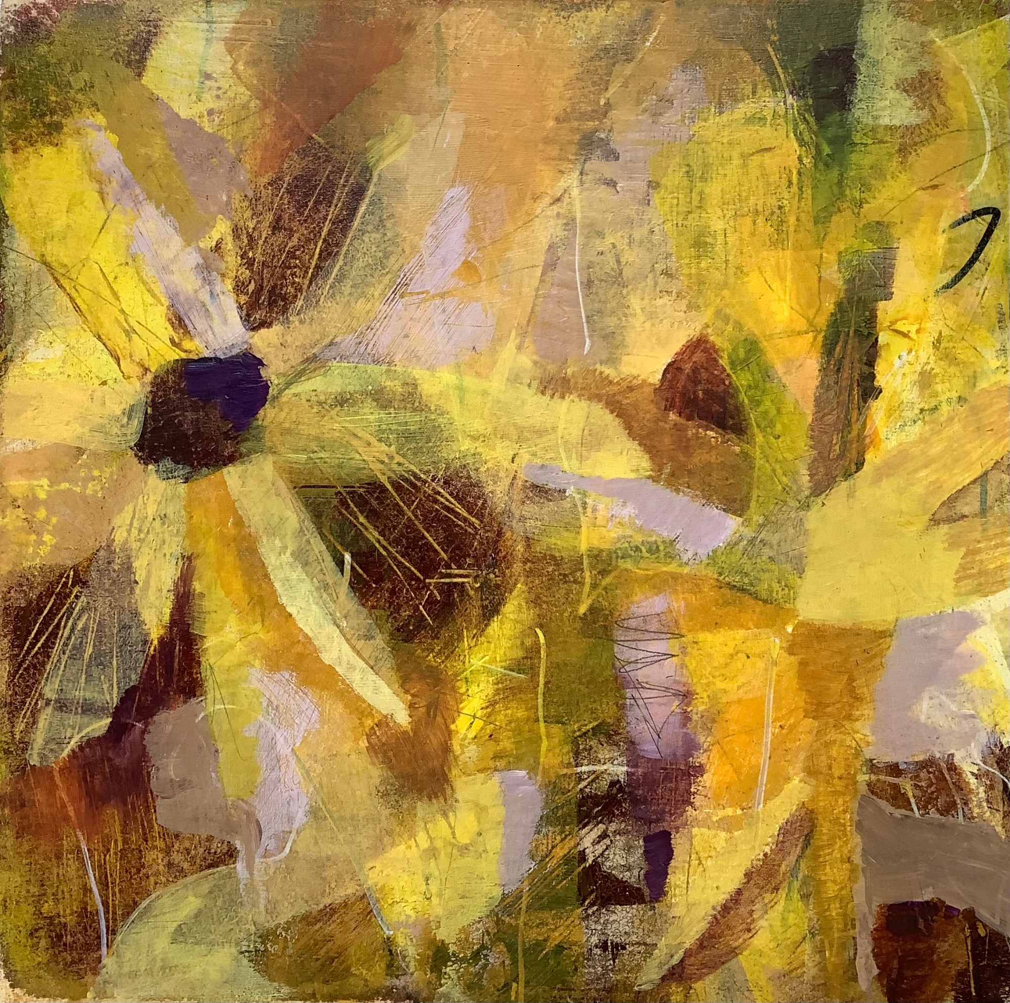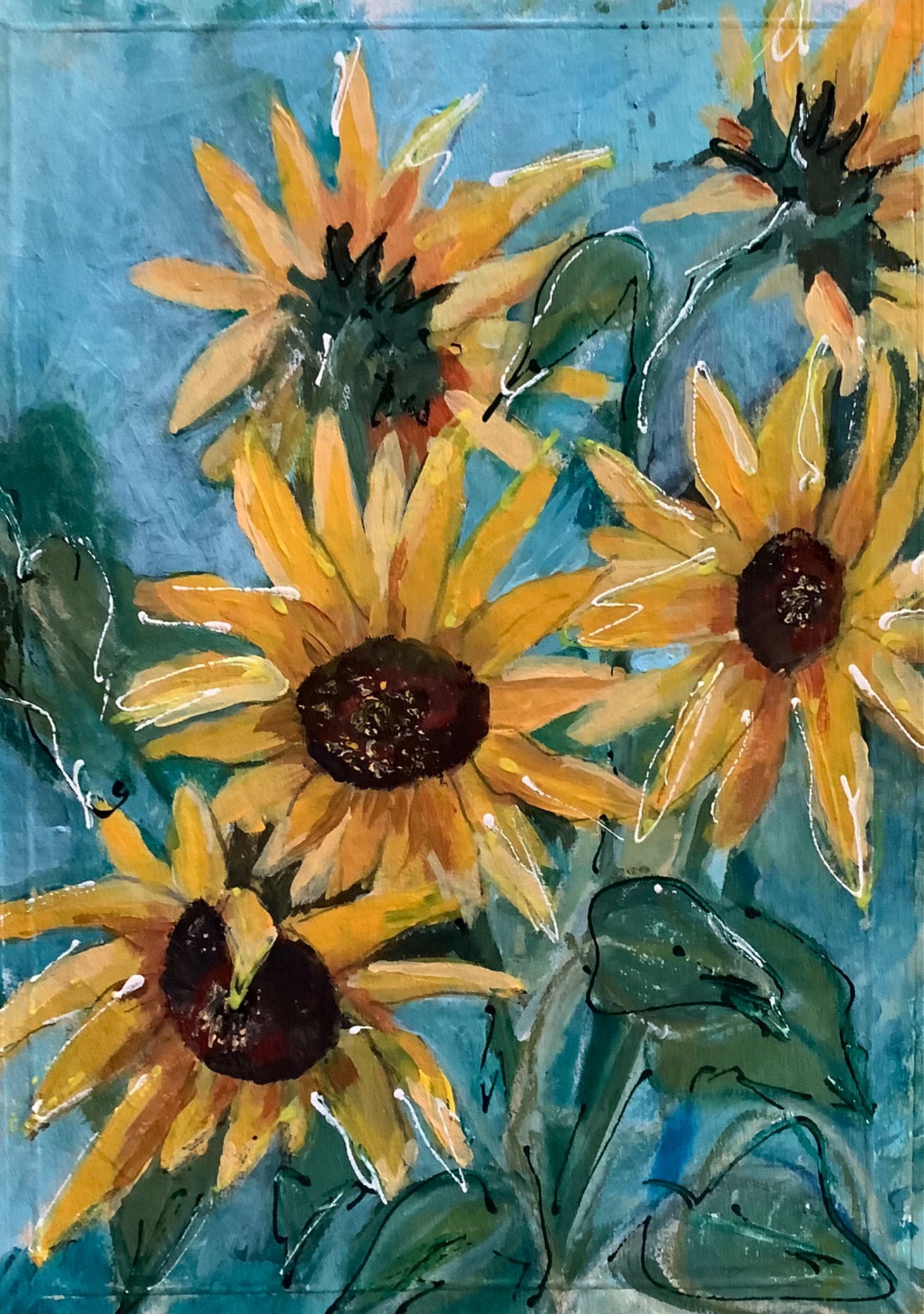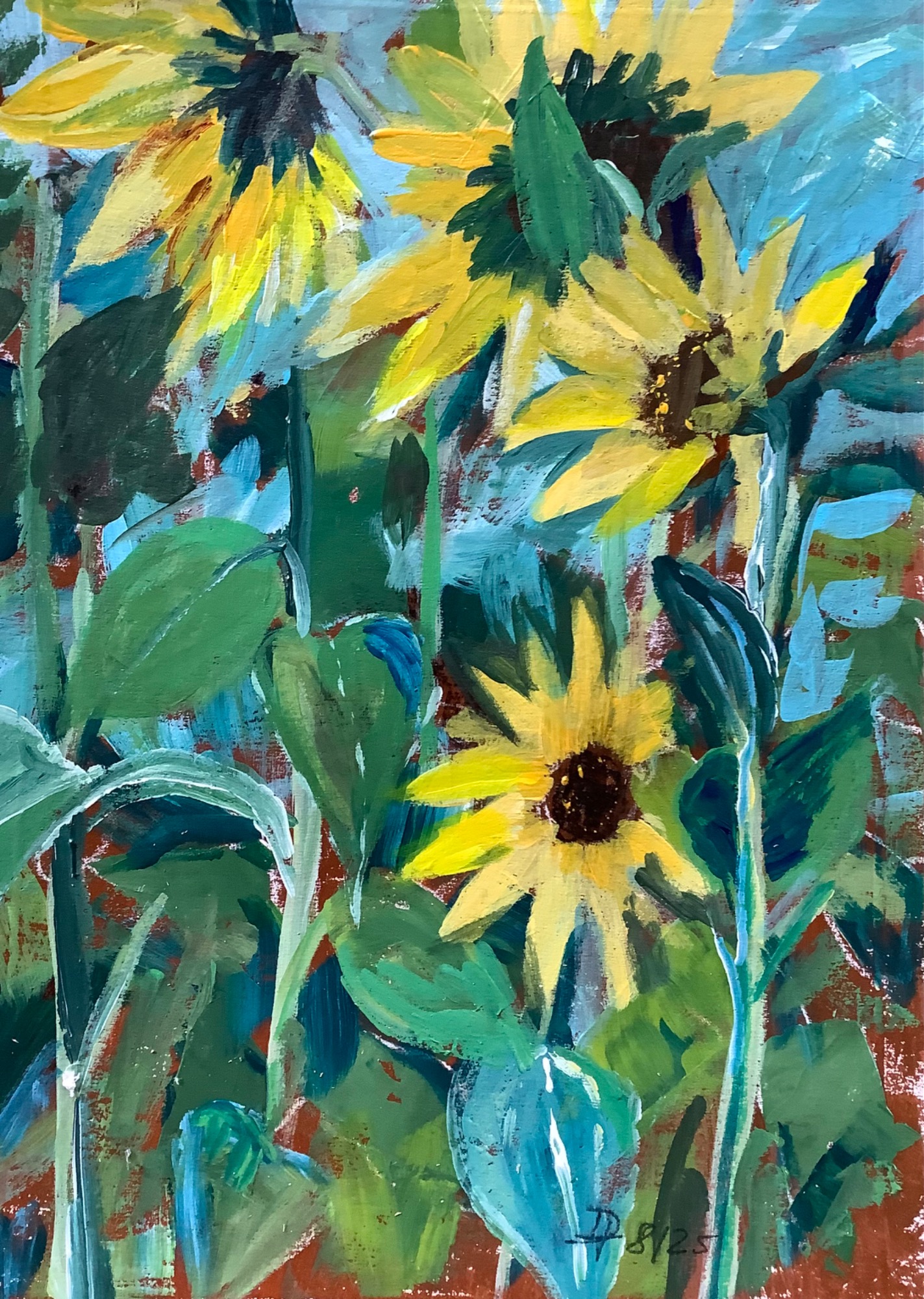 Inspiriert von meinem kleinen Sonnenblumenfeld im Garten ist diese Serie entstanden. Ich hatte so große Lust nach Beobachtung zu malen. Dabei sind zunächst diese lockeren Skizzen auf Pappe entstanden. Und danach mehr und mehr abstraktere Darstellungen.