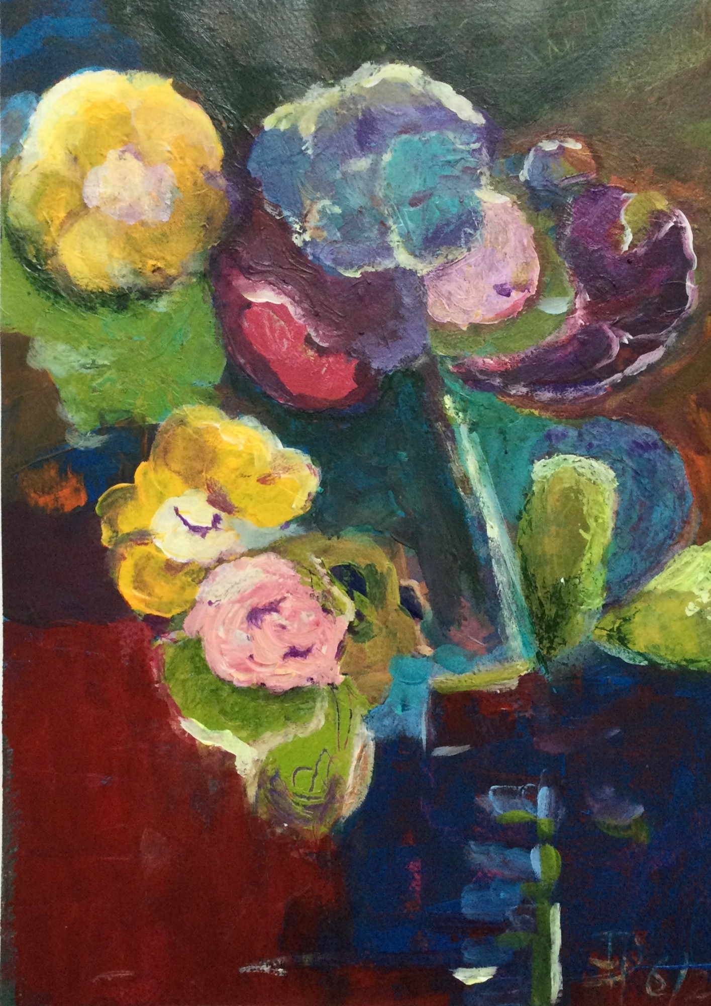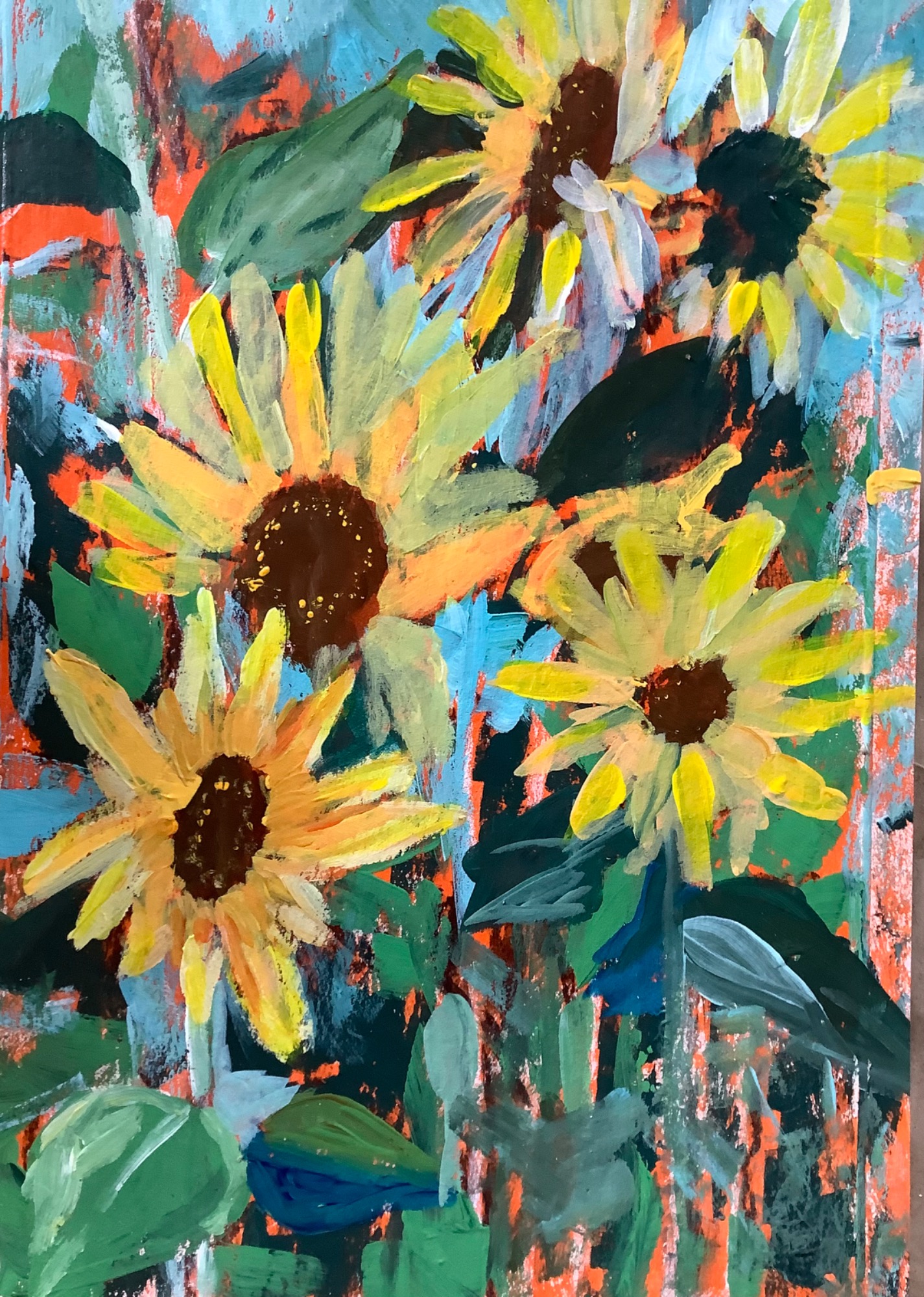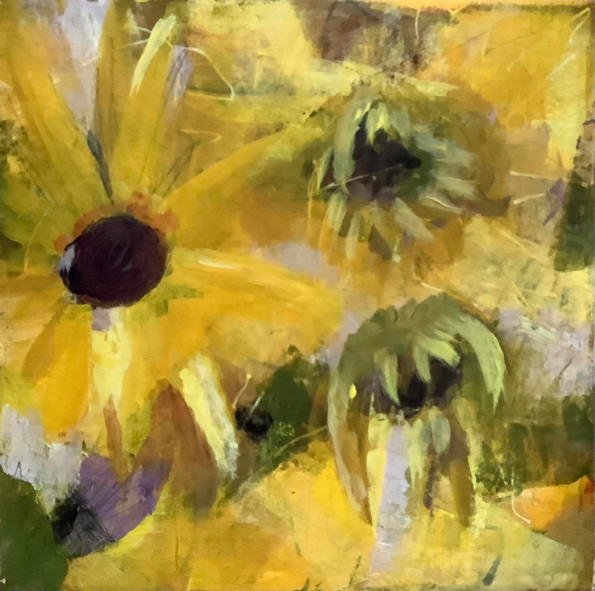 Inspiriert von meinem kleinen Sonnenblumenfeld im Garten ist diese Serie entstanden. Ich hatte so große Lust nach Beobachtung zu malen. Dabei sind zunächst diese lockeren Skizzen auf Pappe entstanden. Und danach mehr und mehr abstraktere Darstellungen.